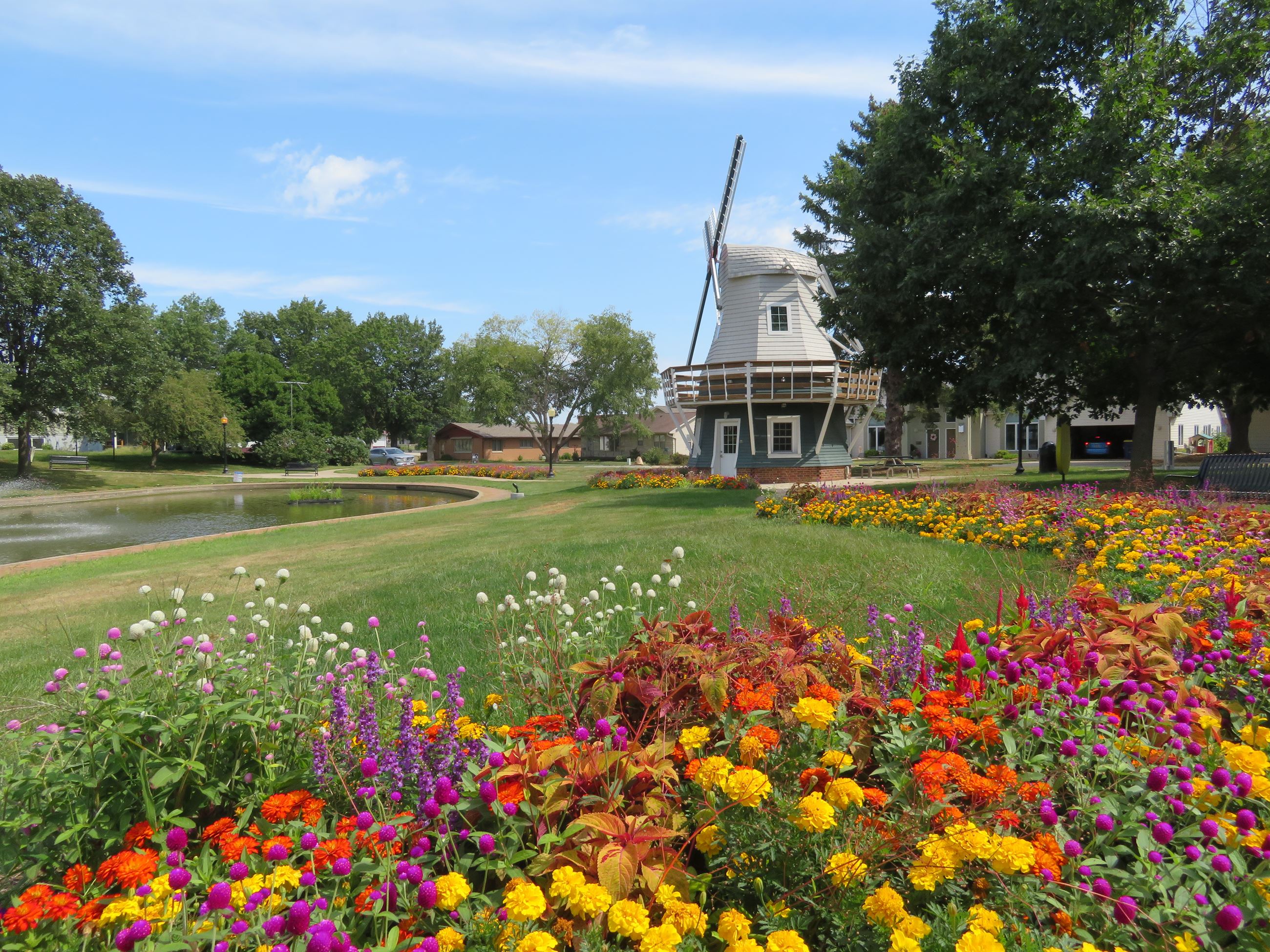 FEATURES: windmill, turn of the century benches, trees, formal tulip beds (13,000 tulips planted here annually), pond, ice skating (when frozen)